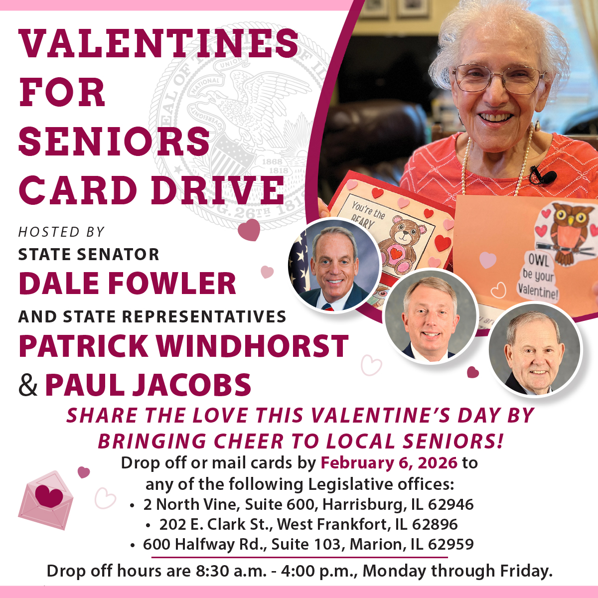 Harrisburg, IL – State Representative Patrick Windhorst is teaming up with State Senator Dale Fowler and State Representative Paul Jacobs to invite residents to help spread kindness this Valentine’s Day through a Valentine’s for…